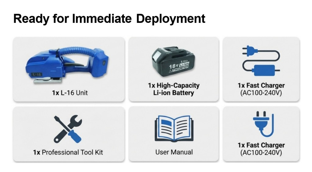 Powered by a long-life lithium battery (up to 500 charge cycles), it charges in 40–90 minutes and can complete about 400 strapping cycles on a full charge. Each unit comes with 1 battery, 1 charger, a tool kit, and a user manual — ready for immediate use.
