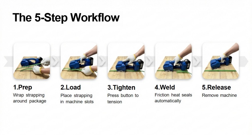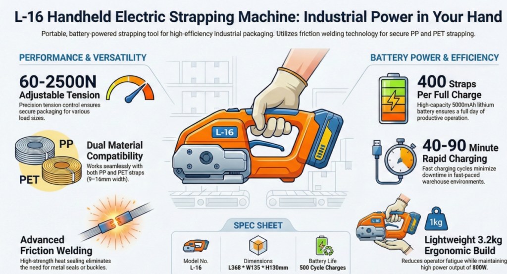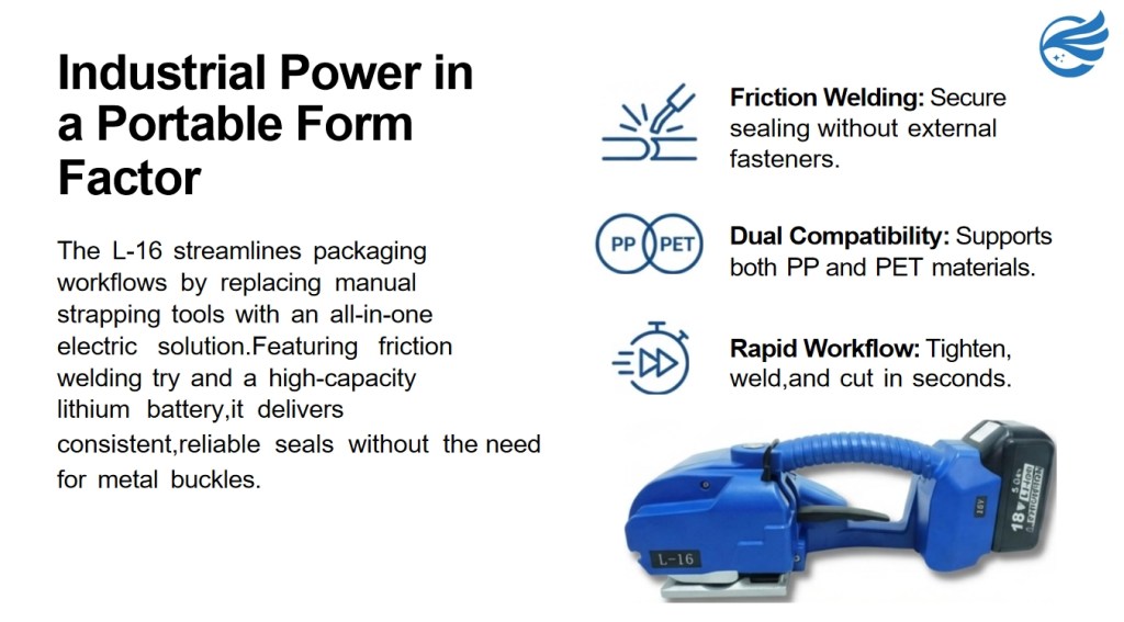 This portable electric strapping machine features friction welding sealing, supporting both tensioning mode and one-touch tensioning mode. Compatible with PP/PET strapping bands (9–16mm width, 0.6–1.2mm thickness), it delivers stable and reliable sealing performance.